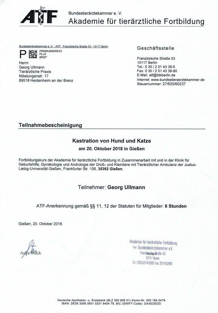Roberto Köstlin Prof. Dr. med. vet., Zusatzbezeichnung Augenheilkunde, Chirurgische und Gynäkologische Kleintierklinik, Ludwig Maximilians-Universität, München ATF Anerkennung 13 Stunden